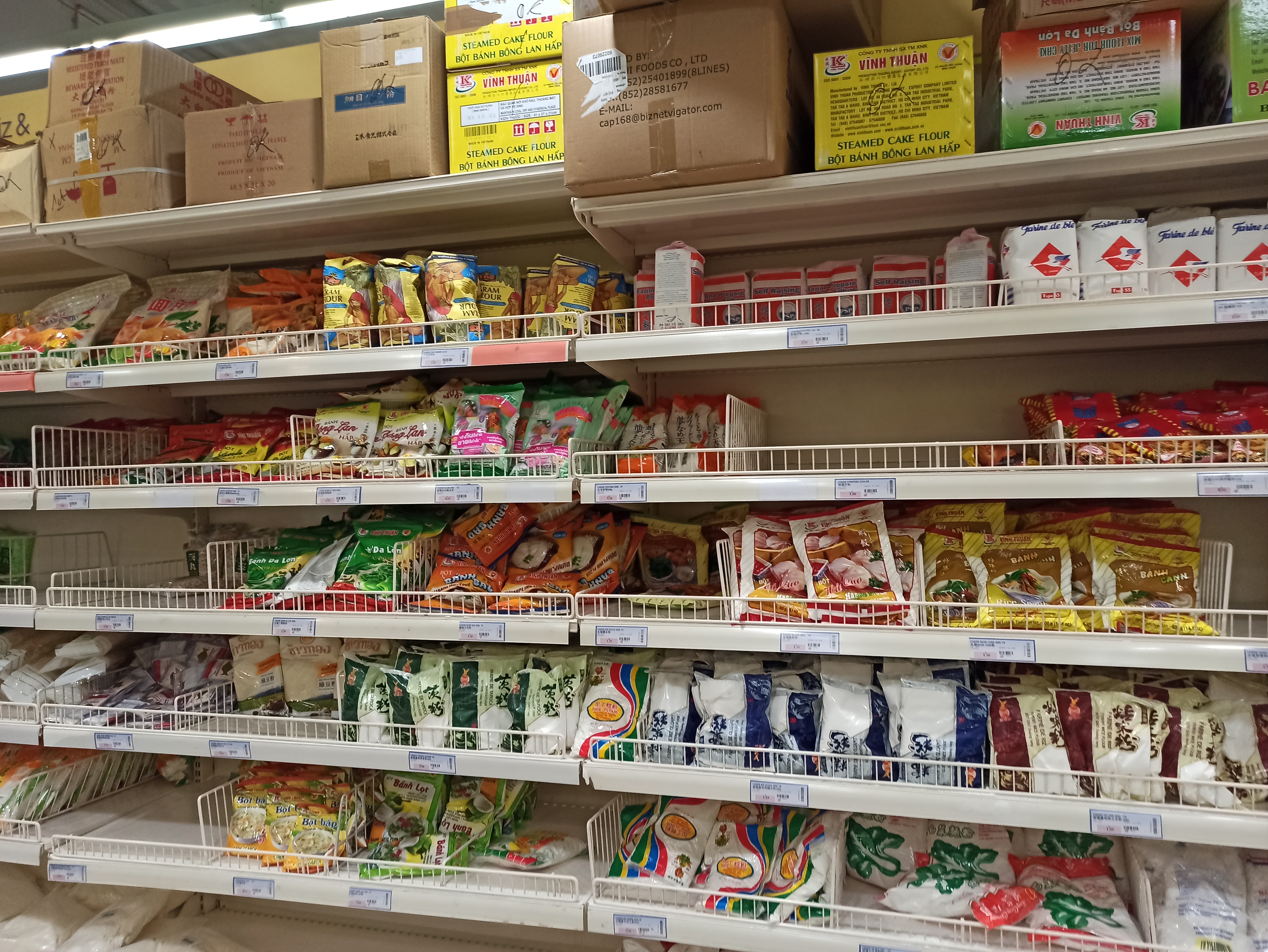 On trouve de tout comme les20kilos de riz basmati à 49€, ou d'autres produits frais (légumes, soja, fruits) et du congelé (nems, bouchons, raviolis, wakamé et divers poissons ou morceaux de poissons. N'oublions pas le rayon boucherie avec du canard laqué et autres viandes Tous les rayons sont garnis de beurre de cacahuètes, toutes sortes de piments En plus ils font en ce moment journée continue de 9h30 à 17h45 à cause du machin Covid